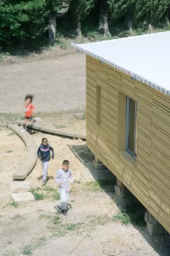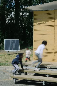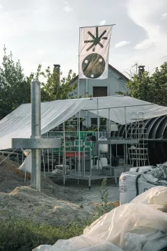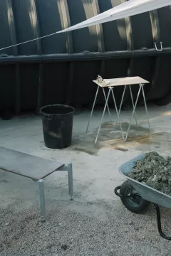 acier galvanisé, bois, pierre