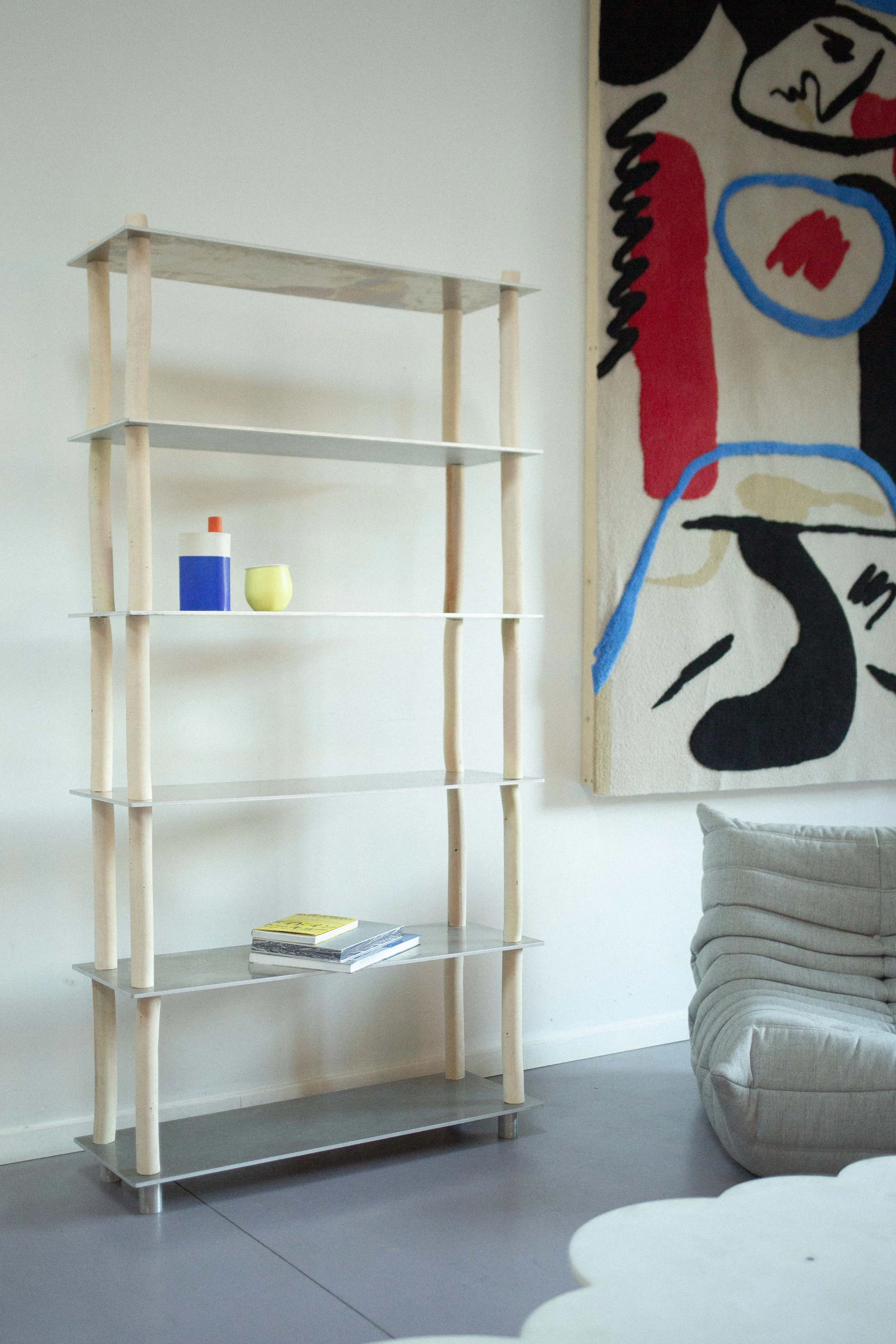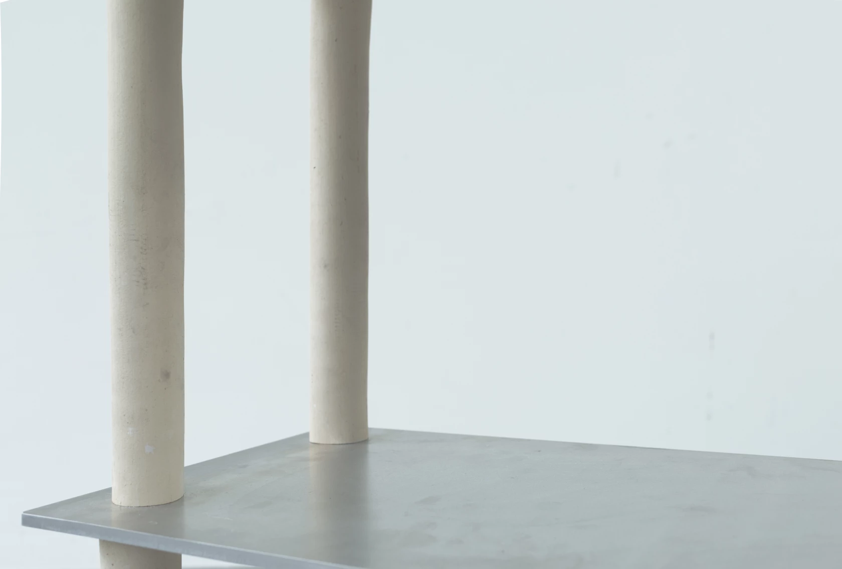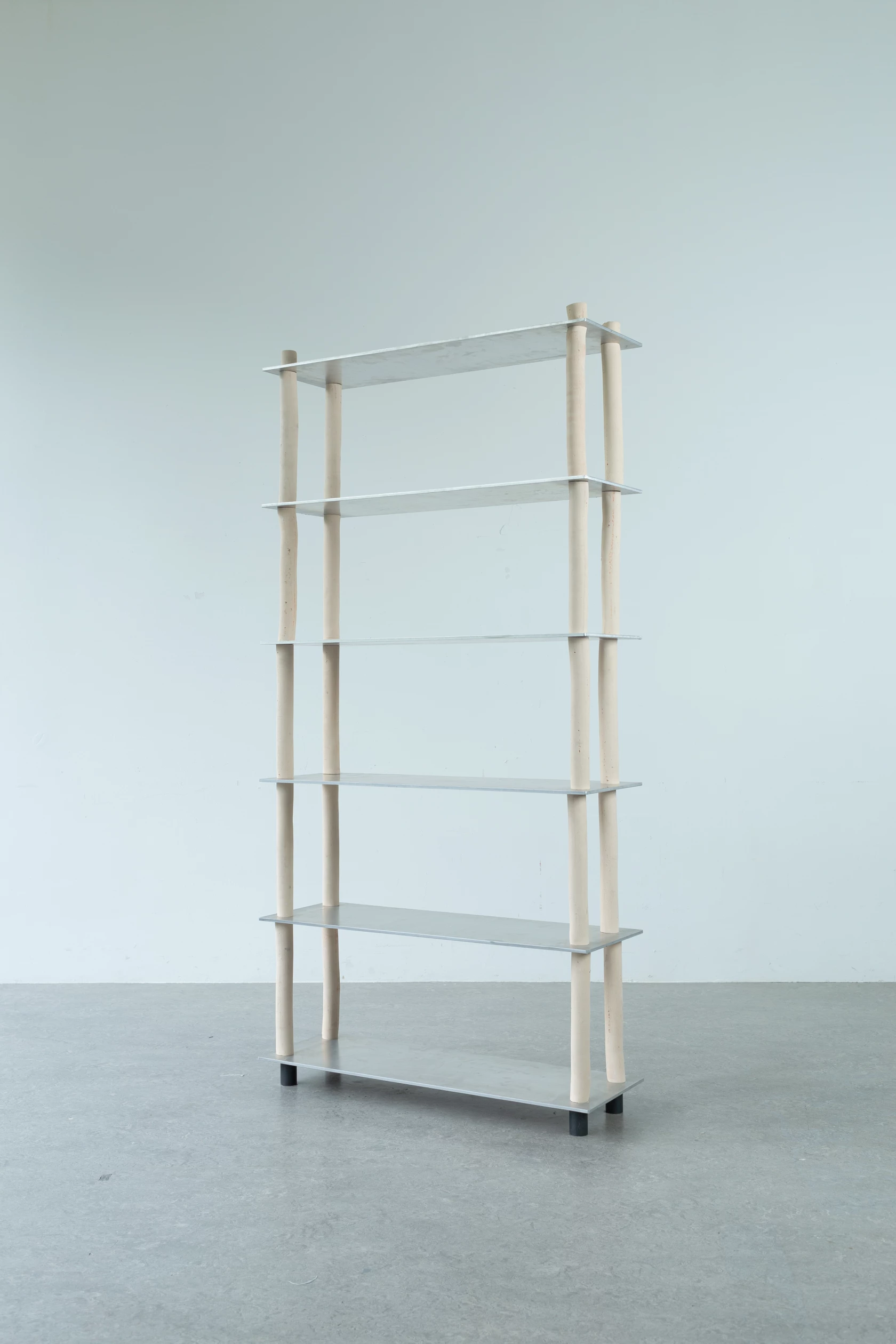 La bibliothèque OS est composée principalement de deux éléments : des plateaux d’aluminium et des tubes de faïence cuits à basse température, extrudés à la main. L’irrégularité de la terre se mêle à la précision de l’aluminium. L’étagère semble fragile et se construit comme un squelette. Le meuble repose sur un système d’empilement et de compression qui permet un montage simple.