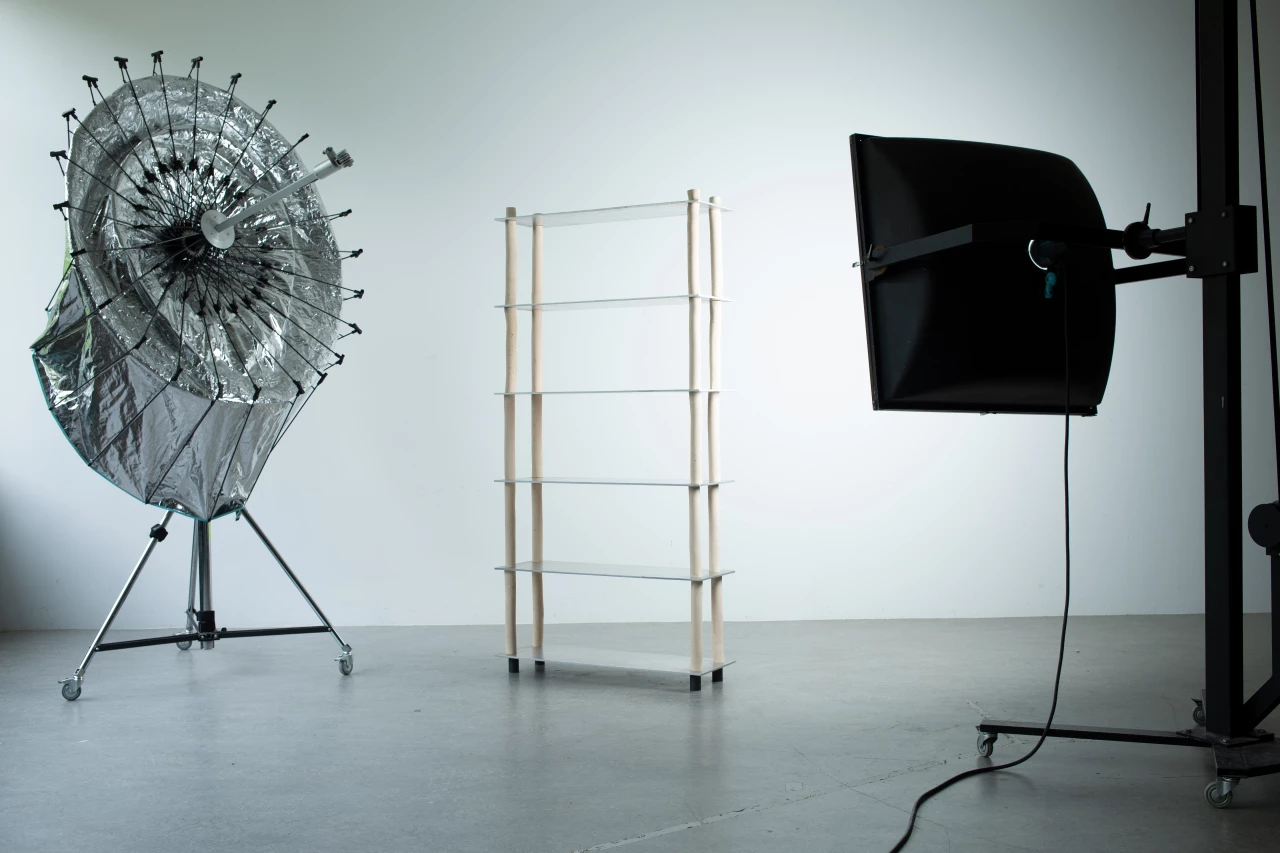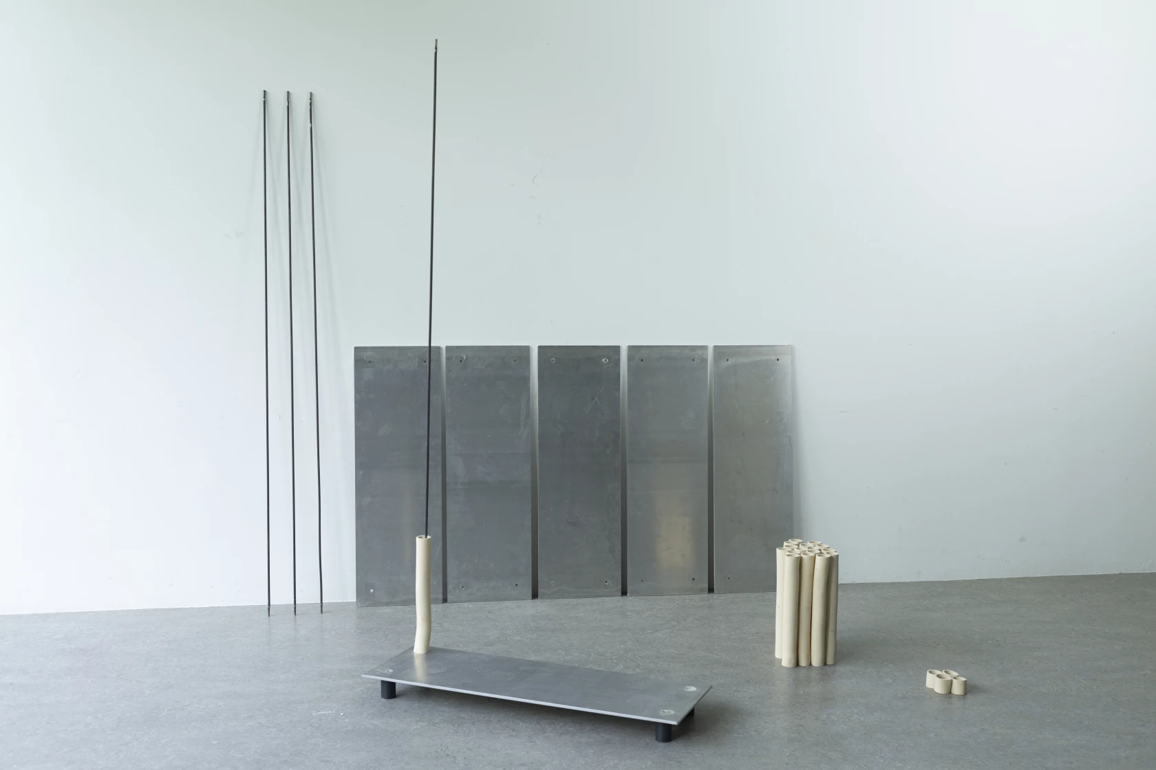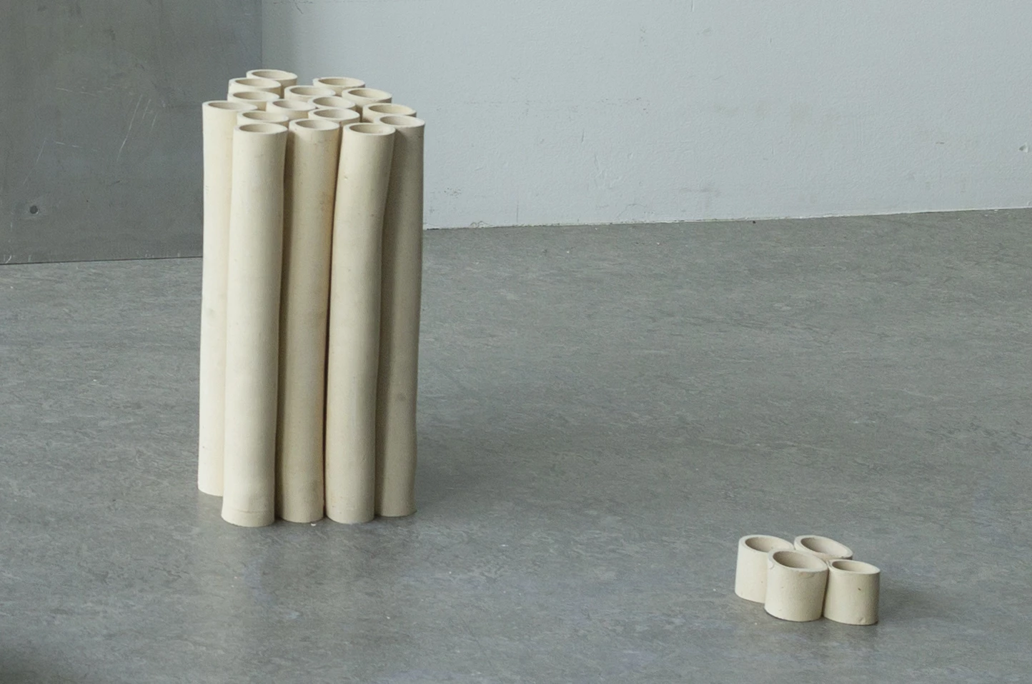 La bibliothèque OS est composée principalement de deux éléments : des plateaux d’aluminium et des tubes de faïence cuits à basse température, extrudés à la main. L’irrégularité de la terre se mêle à la précision de l’aluminium. L’étagère semble fragile et se construit comme un squelette. Le meuble repose sur un système d’empilement et de compression qui permet un montage simple.