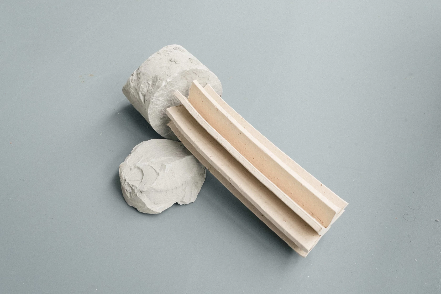 C’est ce dialogue entre un savoir-faire industriel et des prélèvements acupuncturels d’argile que l’étagère tend à exprimer. L'argile est issu d'une démarche de la valorisation de la terre de site excavé lors de chantier architecturaux du Grand Paris. La terre utilisé pour la bibliothèque OS à été extraite à Clamart où le projet architectural est à l'oeuvre. C'est une marne verte-grisätre qui, cuit à 980 degrès celsius, se transforme en une faÏence blanche.