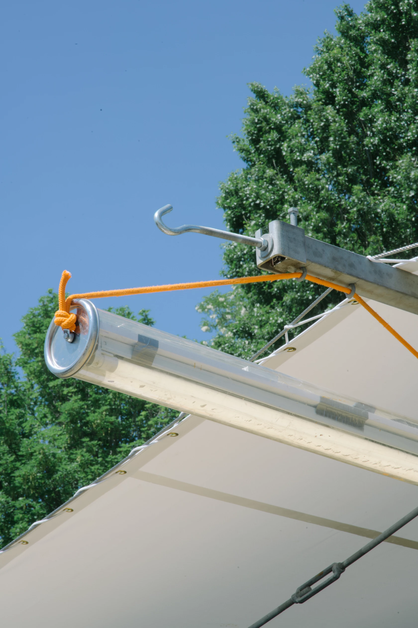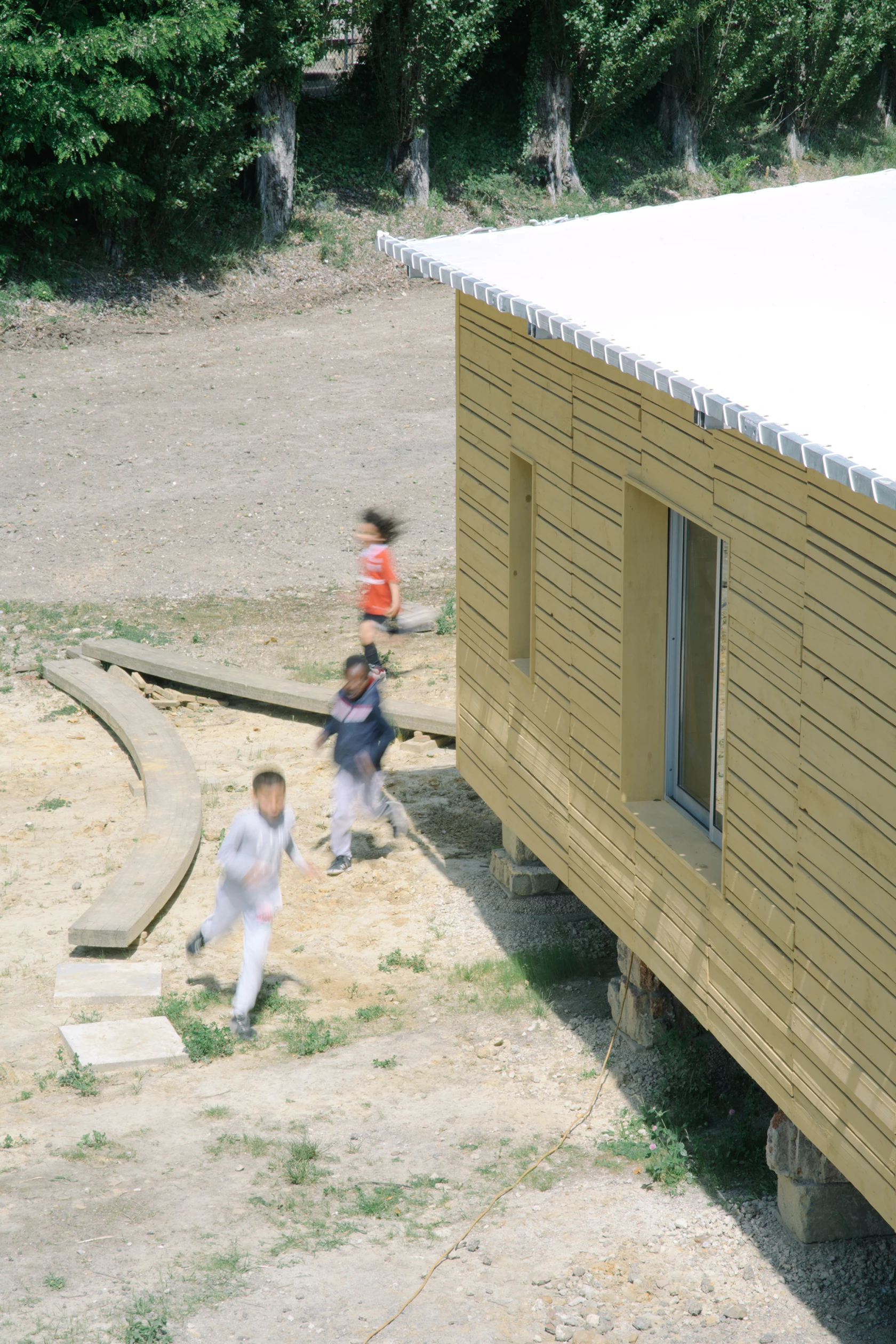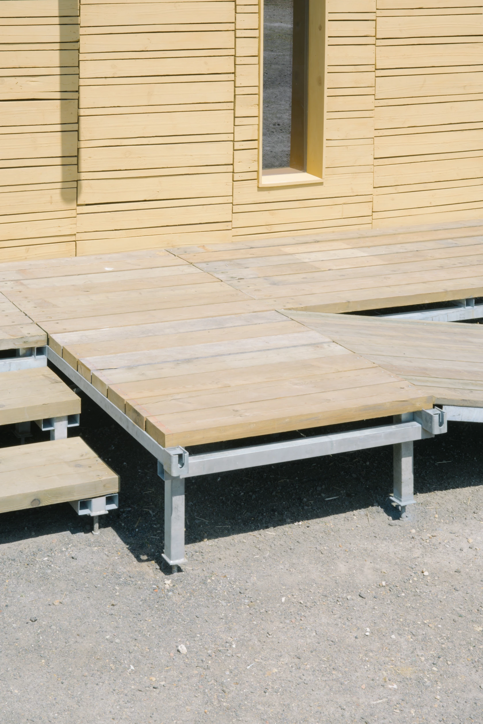 La toiture et la terrasse ont été construites à partir d’une ancienne bulle de tennis. Toutes deux, sont entièrement réalisées avec ce gisement. Pensée comme une salle de classe extérieure, la terrasse déployée, sert de scène et de gradin.