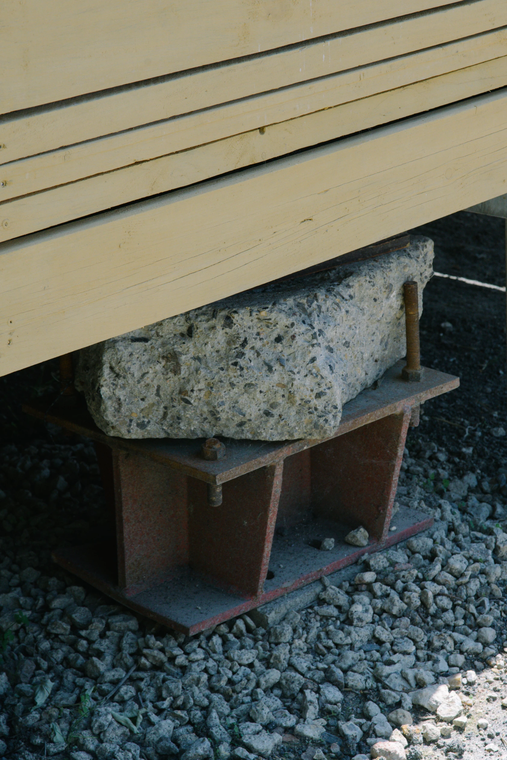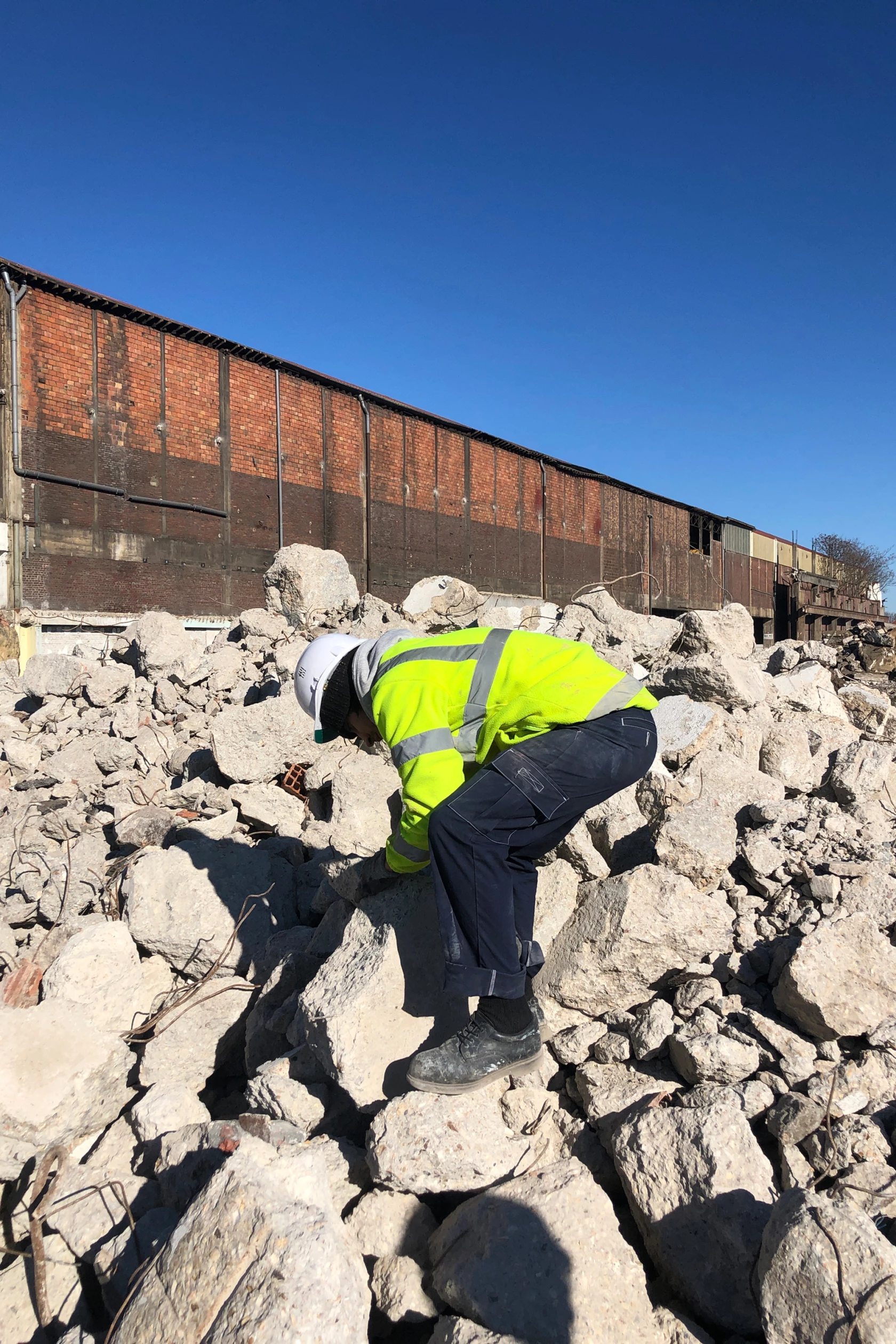 Les fragments de murs et de dalle de béton sont issus de la déconstruction de l’ancienne usine KDI à la Courneuve. Ils servent de fondations et portent l’histoire de ce lieu, situé en face de notre atelier, qui vit une transition similaire à celle du site du Lycée avant le lycée.