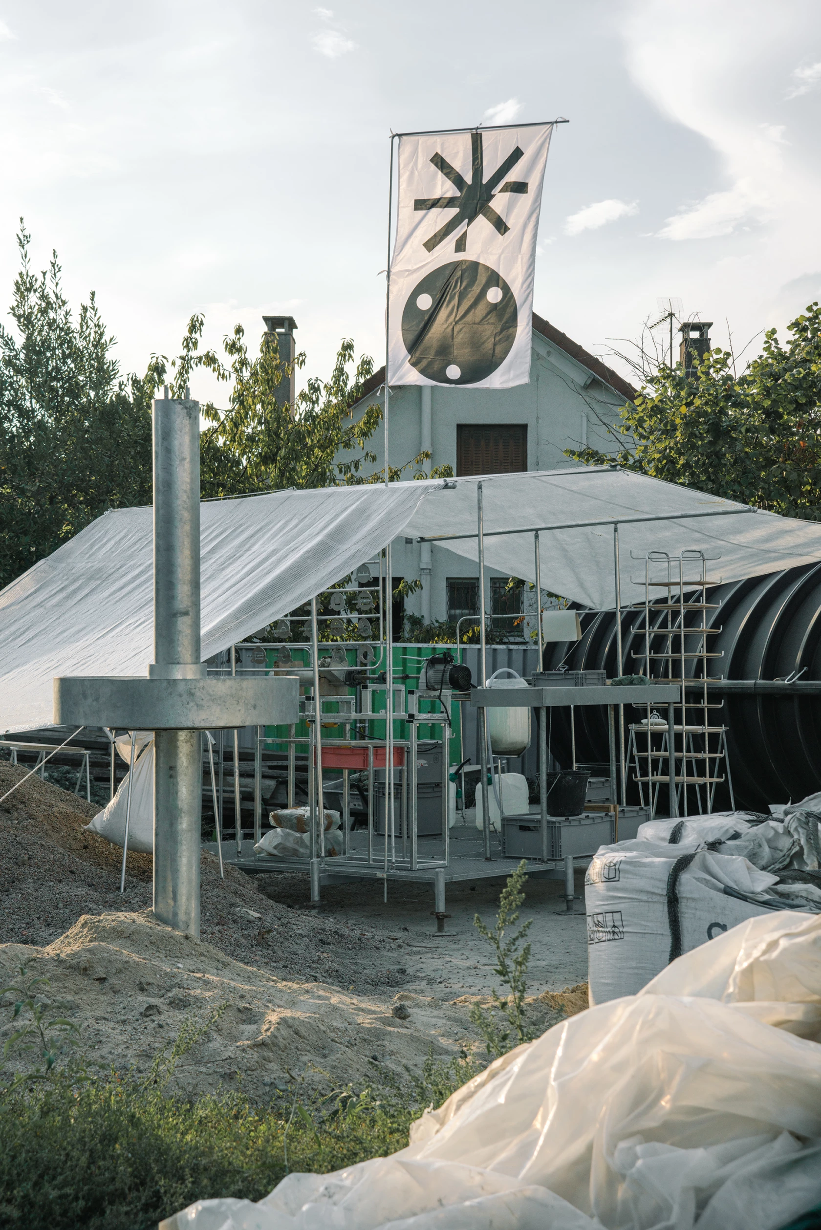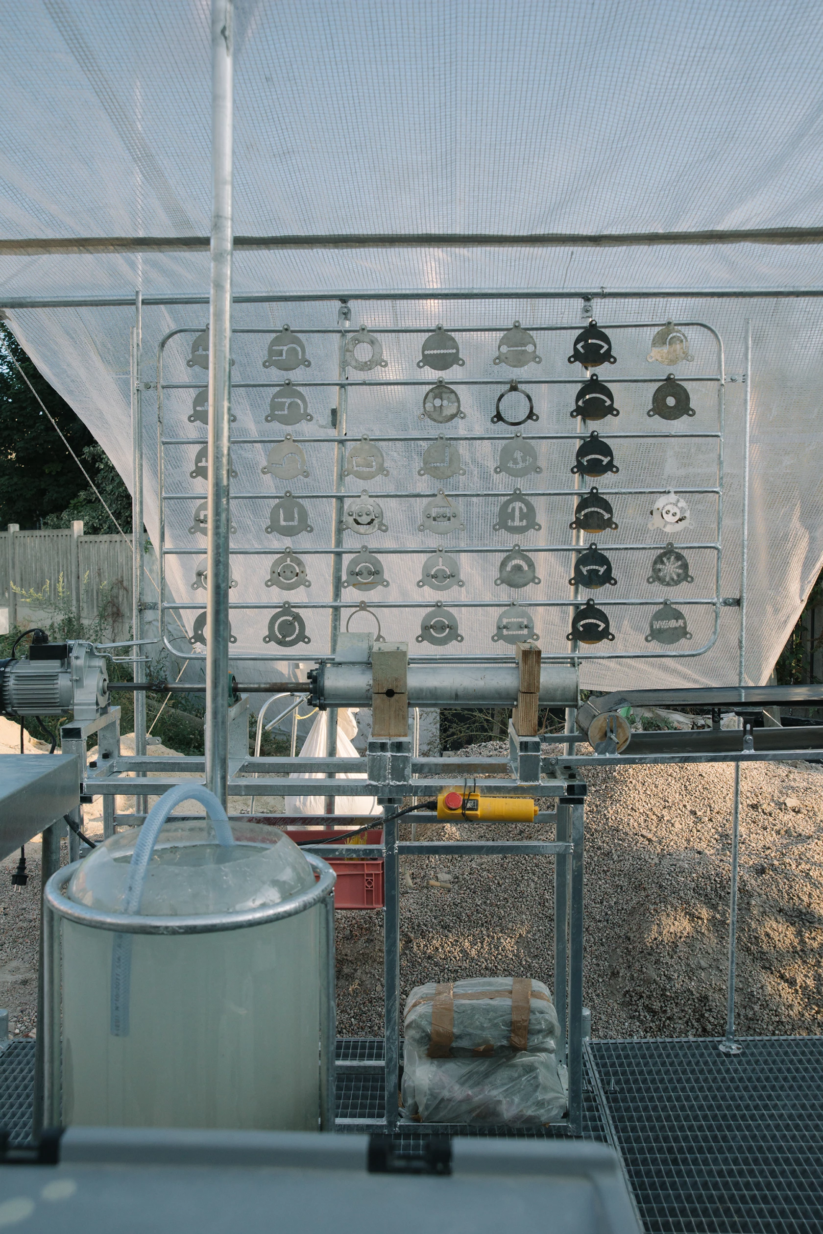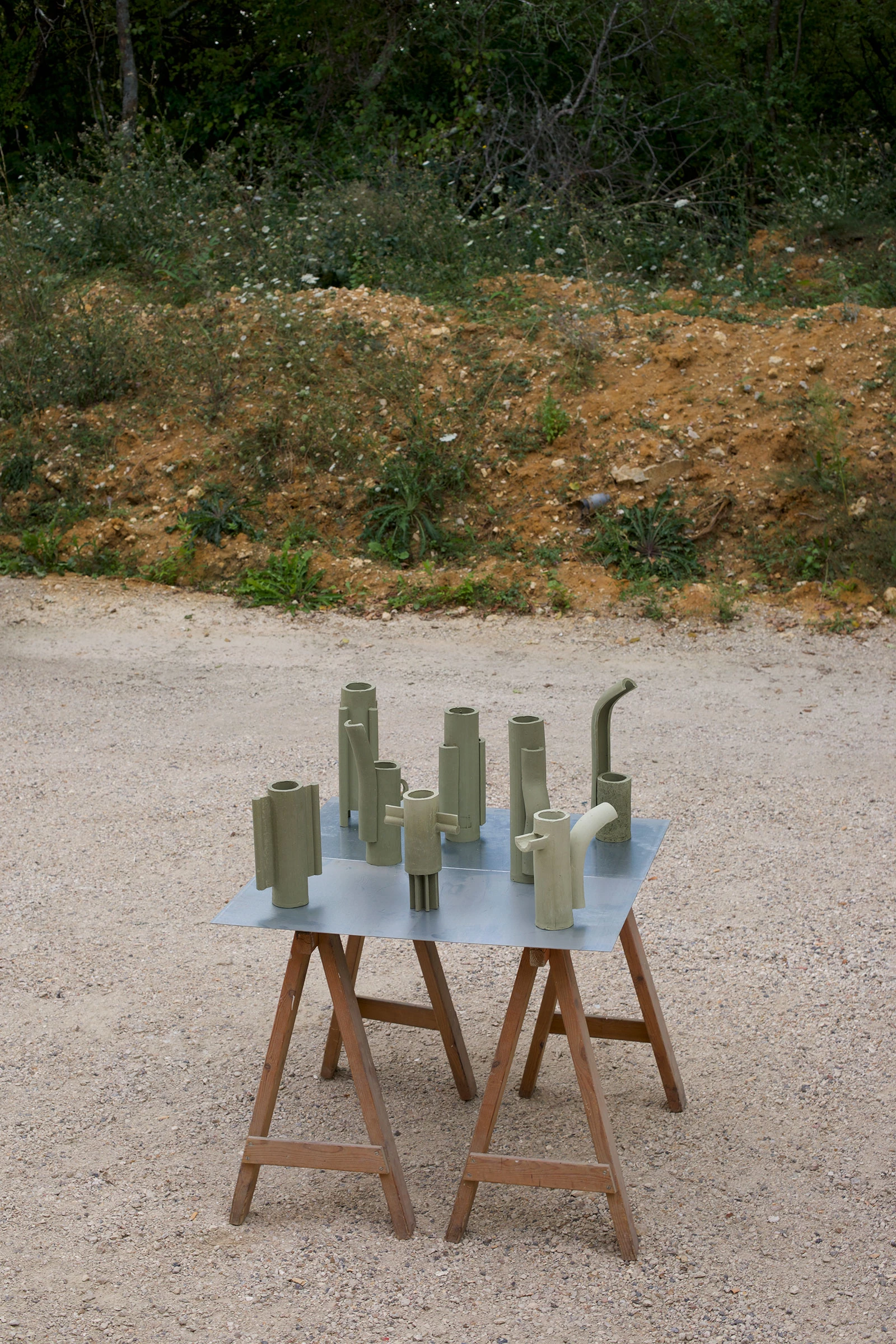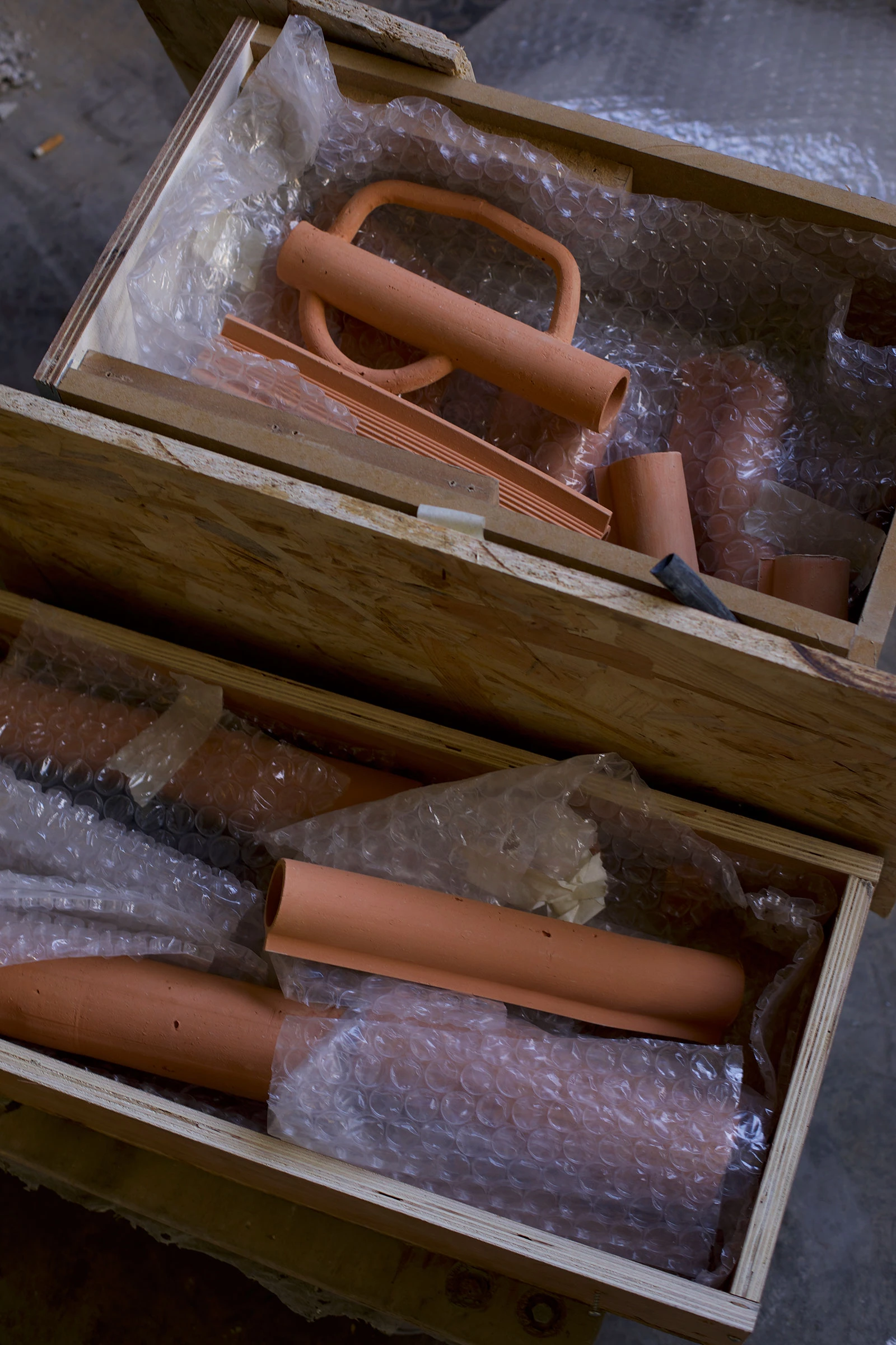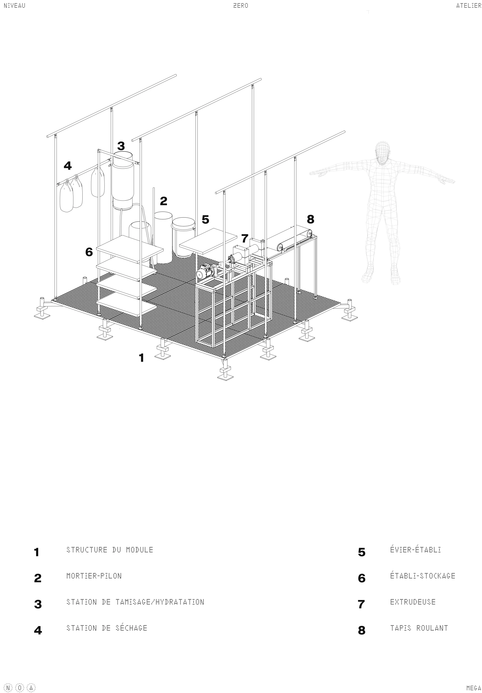 Comment valoriser un gisement et sa ressource ? Comment ouvrir le chantier à des publics, décloisonner cet espace souvent fermés et inaccessible ? La production in situ est pour nous un élément de réponse à ces problématiques. L’outil de recherche et de production semi-industriel M.E.G.A. rassemble en son sein toutes les étapes de production d’objets en terre cuite, de la transformation du matériau brut en matière première jusqu’à la cuisson des objets obtenus.