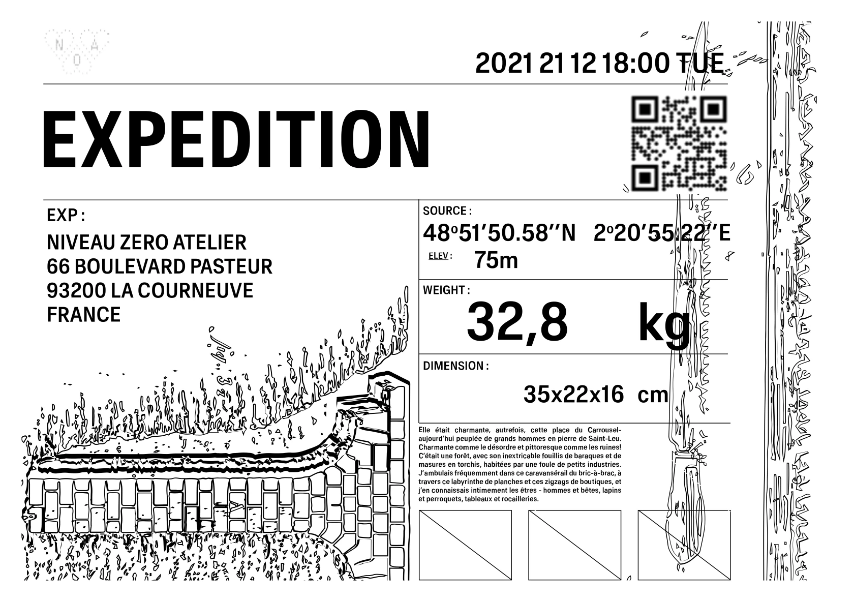 "No tracking number est le titre d'un objet créé par Niveau Zéro Atelier à l'invitation de Disque Bleu et exposé au Jeu De Paume à l'hiver 2021. Il dialogue avec un bouquet de fleur créé pour l'occasion par Disque Bleu.