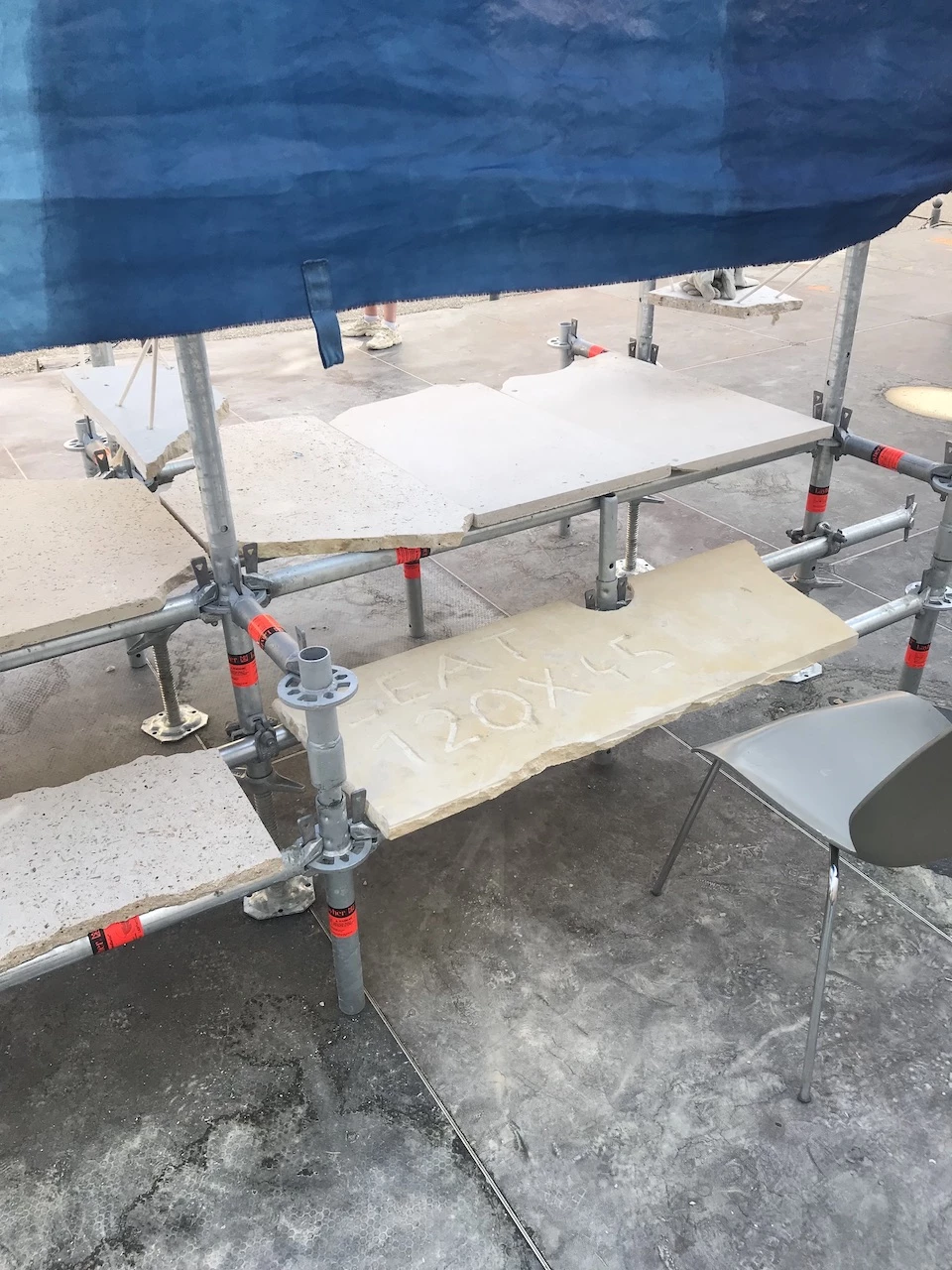 Dans le cadre de la Biennale d’Architecture et du Paysage 2022, et sur l’invitation d'Atelier Fanelsa, Niveau Zéro a proposé aux participant·es une exploration autour de deux matériaux : des échafaudages, hérités du gigantesque chantier de rénovation opéré par Layher dans l'école nationale d'architecture de Versailles, où prenait place le workshop, et des pierres calcaires du bassin de l’Oise, d'où sont issues la majorité des pierres du Versailles historique. Par leur présence donnée, ces deux matériaux et leur adjonction se sont imposés comme une évidence, tout en étant idéaux pour une experimentation constructive rapide et intense.